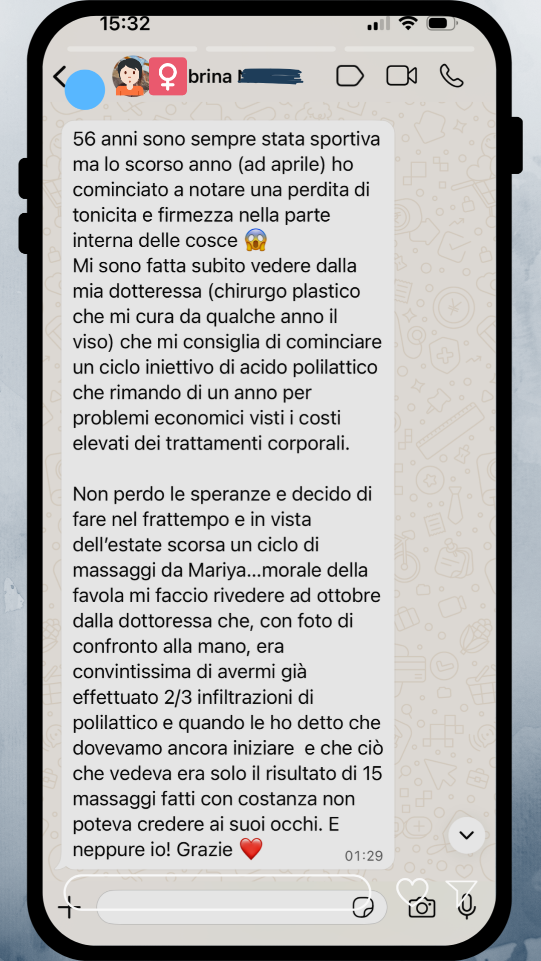 Michela A. Ho fatto un massaggio con Mariya che è stata molto accurata e disponibile, mi ha spiegato passo passo quello che avrebbe fatto durante il massaggio. Superconsigliata.