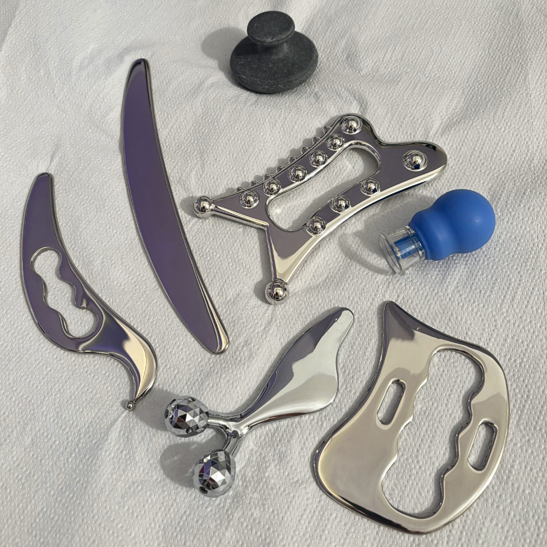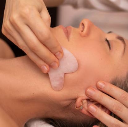 Tecnica tradizionale della Medicina Tradizionale Cinese (MTC), il Gua Sha viso utilizza pietre naturali (quarzo/giada) e tool in acciaio inox professionale per favorire drenaggio linfatico, lift dolce e rilascio delle tensioni.